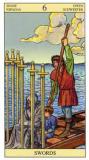 宝剑牌组代表的是空气的元素,而这张侍卫牌则是空气元素中空气的部分。你可以发现到这个侍卫双脚离地甚远。这表示一种生活的态度,这种态度要求你透过梦境和思想让自己从现实抽离出来。